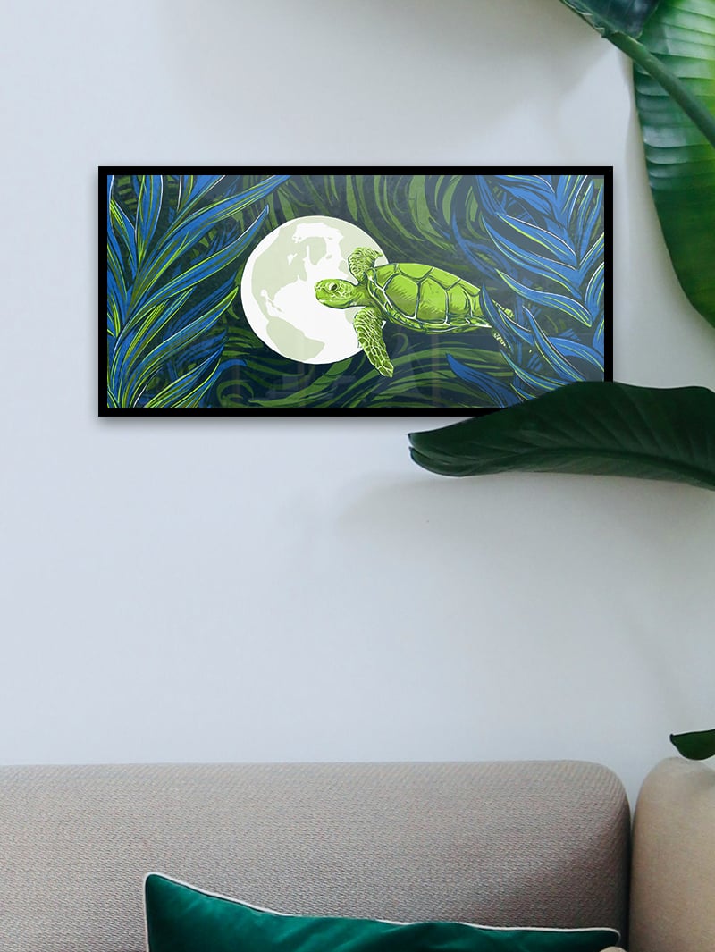 Minogame's Earth is a joyful respresentation of the World Turtle as a protector for our dear green globe. It's the final piece of the triptych featuring the celestial body's guarded by mythological creatures.